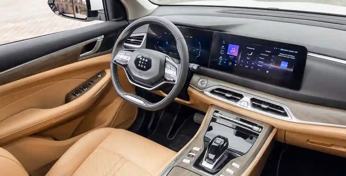 Салон решен в лаконичном и благородном ключе. В компании называют этот стиль "премиальным минимализмом". Фактура добротных отделочных материалов и некоторые эргономические решения напоминают о больших вэнах Mercedes-Benz. Кластер 12-дюймовых "приборки" и "тачкрина" имеет отличную графику, на блики нет и намека. Но главное - в такой инструментарий сразу влюбятся владельцы гаджетов Huawei.
