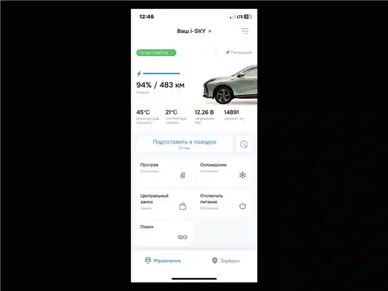 Всего у EVOLUTE i‑SKY три режима движения, кроме «спорта» есть еще «эко» и «нормальный». И быстро приучаешься большую часть времени ездить в «эко», Потому что оптимистические 560 с лишним запаса хода при на 98% заряженной батарее – такие данные высвечивались на приборной панели выданного мне в пресс-парке EVOLUTE i‑SKY – в реальности быстро уполовинились. Правда, стоит учесть и использование кнопки «приготовить автомобиль к поездке» на экране смартфона. Да-да, мобильное приложение EVOLUTE не только дистанционно мониторит состояние и местонахождение автомобиля на карте, но и позволяет заранее включить перед поездкой подогрев батареи и салона. Впервые возможность запустить двигатель и прогреть машину на расстоянии перед поездкой я попробовал в 2018 году на Volvo XC60. Сегодня такая возможность есть EVOLUTE – и спасибо ему за это.